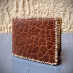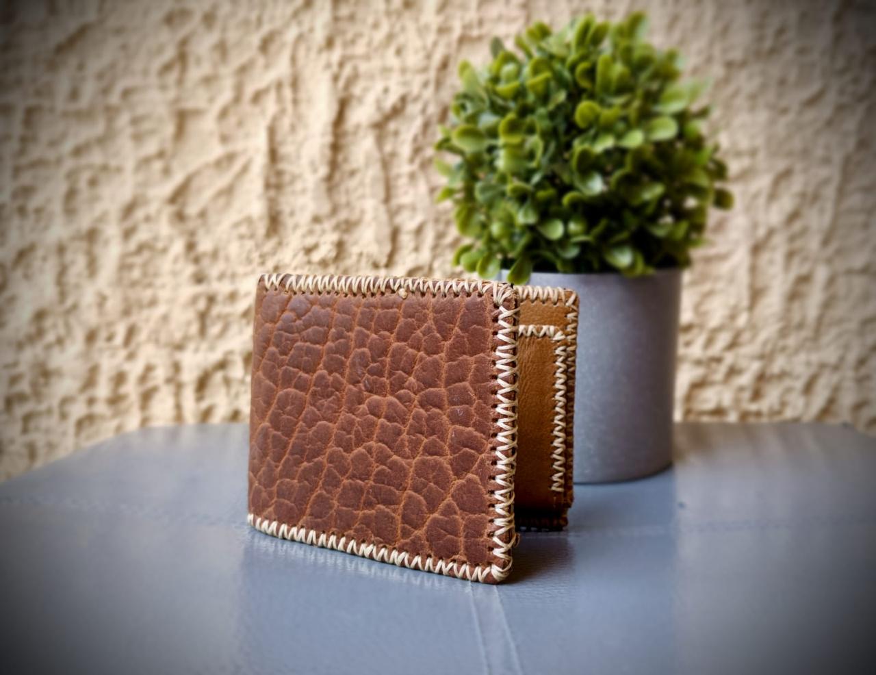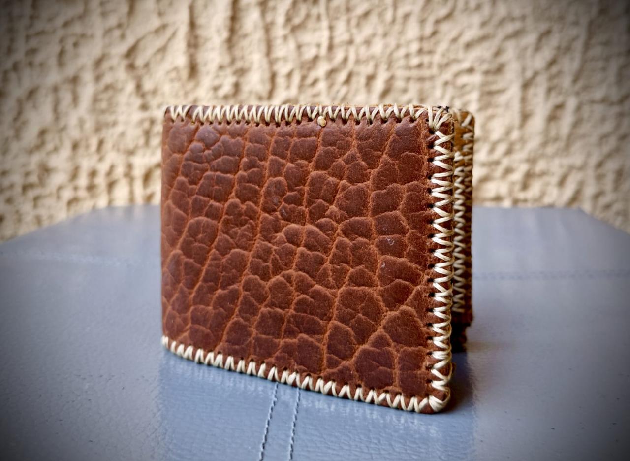 Meticulously crafted, this handmade wallet is made from thick, premium North American bison leather, prized for its distinctive grain and exceptional durability. Expertly stitched by skilled artisans, it combines strength with refined craftsmanship. Designed for everyday use, it naturally develops a rich patina over time, enhancing its character. With a sleek yet spacious design, it comfortably holds all your essentials. More than just an accessory, this sturdy, thick leather wallet is a durable companion, built to last.